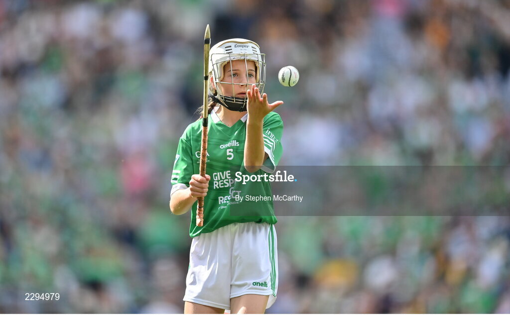 17 July 2022; Lucy Beecher, Scoil Mháirtín, Kilworth, Cork, representing Limerick, during the INTO Cumann na mBunscol GAA Respect Exhibition Go Games at half-time of the GAA All-Ireland Senior Hurling Championship Final match between Kilkenny and Limerick at Croke Park in Dublin. Photo by Stephen McCarthy/Sportsfile