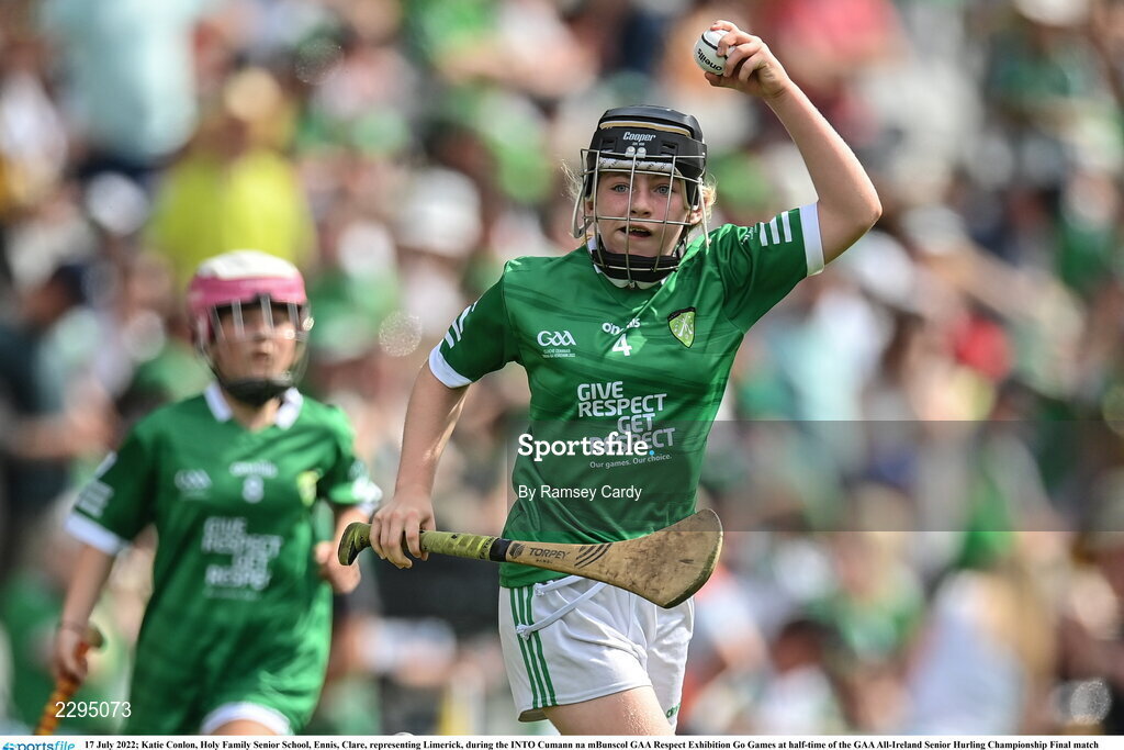 17 July 2022; Katie Conlon, Holy Family Senior School, Ennis, Clare, representing Limerick, during the INTO Cumann na mBunscol GAA Respect Exhibition Go Games at half-time of the GAA All-Ireland Senior Hurling Championship Final match between Kilkenny and Limerick at Croke Park in Dublin. Photo by Ramsey Cardy/Sportsfile