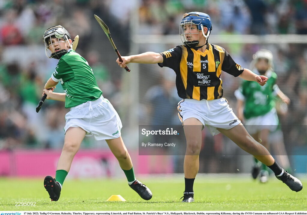 17 July 2022; Tadhg O Gorman, Rahealty, Thurles, Tipperary, representing Limerick, and Paul Batten, St. Patrick's Boys' N.S., Hollypark, Blackrock, Dublin, representing Kilkenny, during the INTO Cumann na mBunscol GAA Respect Exhibition Go Games at half-time of the GAA All-Ireland Senior Hurling Championship Final match between Kilkenny and Limerick at Croke Park in Dublin. Photo by Ramsey Cardy/Sportsfile