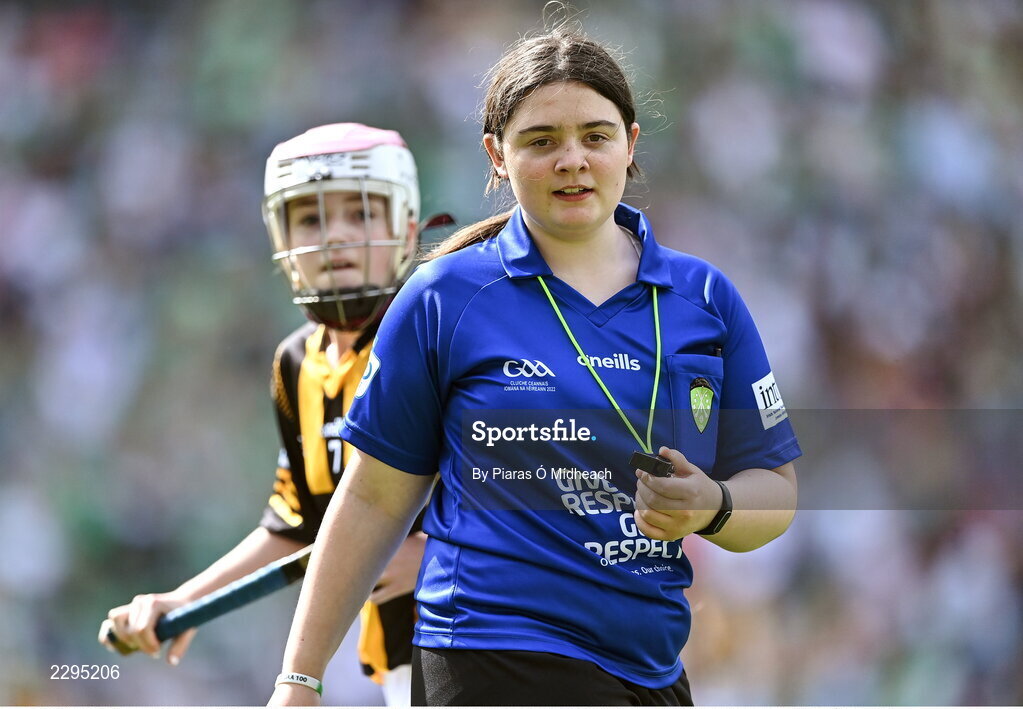 17 July 2022; Referee Tegen Brady, Balbriggan ETNS, Balbriggan, Dublin during the INTO Cumann na mBunscol GAA Respect Exhibition Go Games at half-time of the GAA All-Ireland Senior Hurling Championship Final match between Kilkenny and Limerick at Croke Park in Dublin. Photo by Piaras Ó Mídheach/Sportsfile
