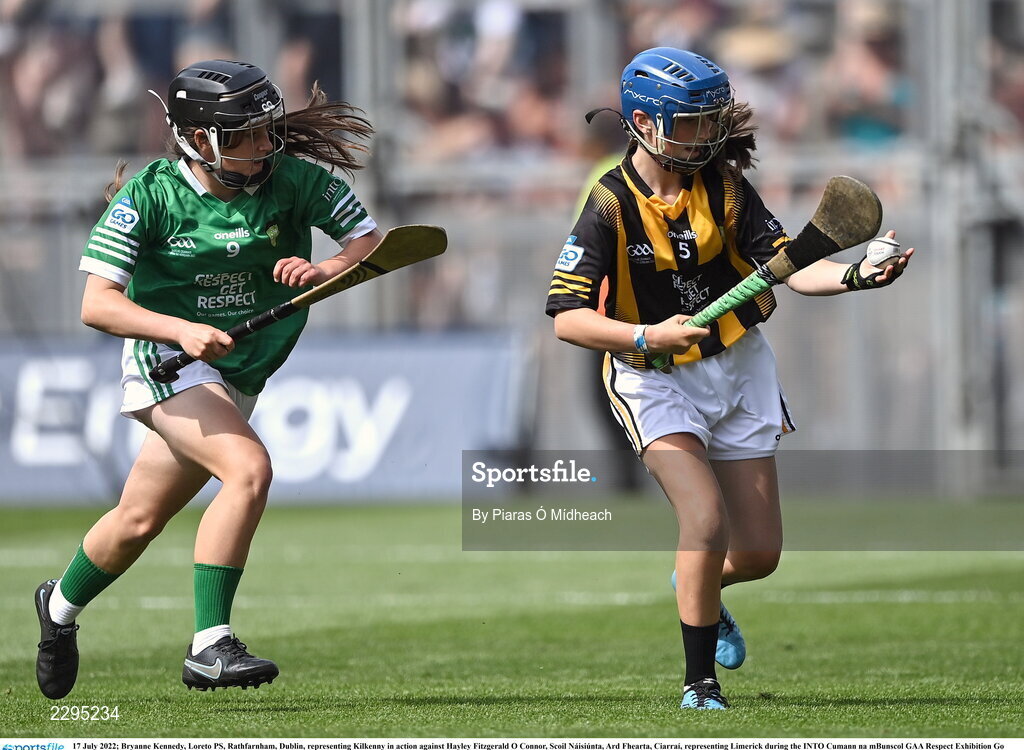 17 July 2022; Bryanne Kennedy, Loreto PS, Rathfarnham, Dublin, representing Kilkenny in action against Hayley Fitzgerald O Connor, Scoil Náisiúnta, Ard Fhearta, Ciarraí, representing Limerick during the INTO Cumann na mBunscol GAA Respect Exhibition Go Games at half-time of the GAA All-Ireland Senior Hurling Championship Final match between Kilkenny and Limerick at Croke Park in Dublin. Photo by Piaras Ó Mídheach/Sportsfile