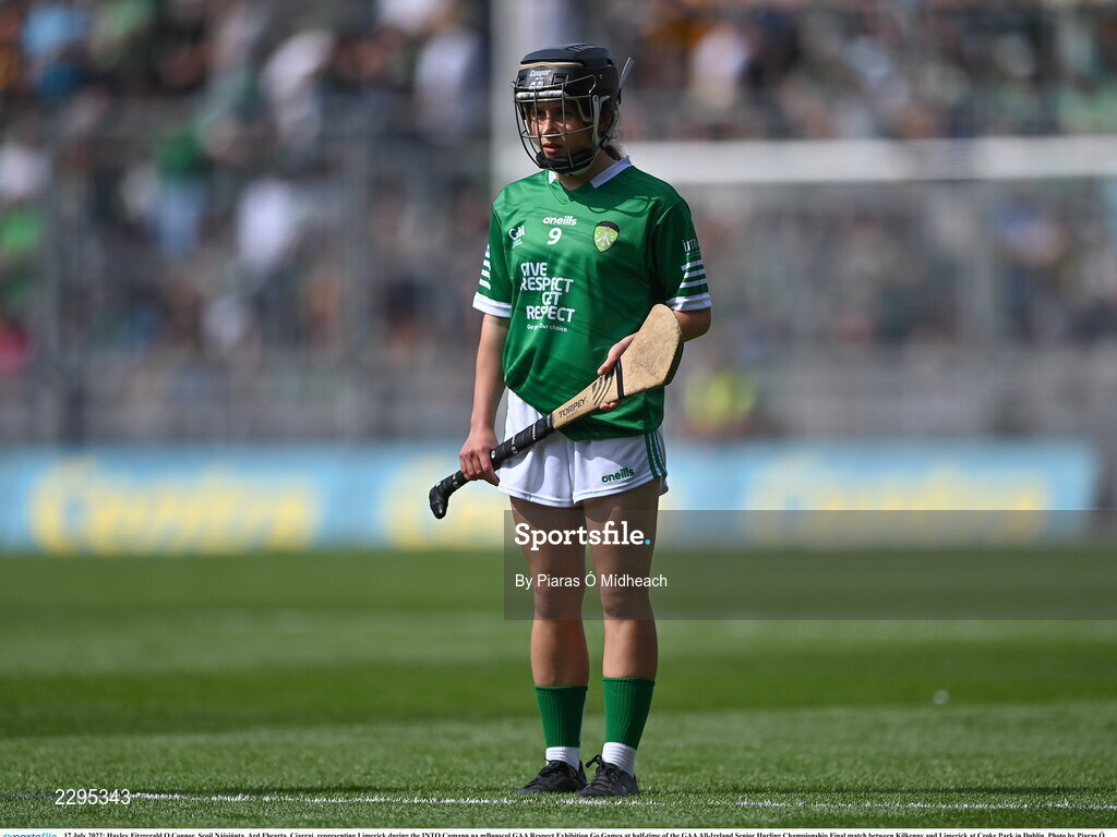 17 July 2022; Hayley Fitzgerald O Connor, Scoil Náisiúnta, Ard Fhearta, Ciarraí, representing Limerick during the INTO Cumann na mBunscol GAA Respect Exhibition Go Games at half-time of the GAA All-Ireland Senior Hurling Championship Final match between Kilkenny and Limerick at Croke Park in Dublin. Photo by Piaras Ó Mídheach/Sportsfile *** ***