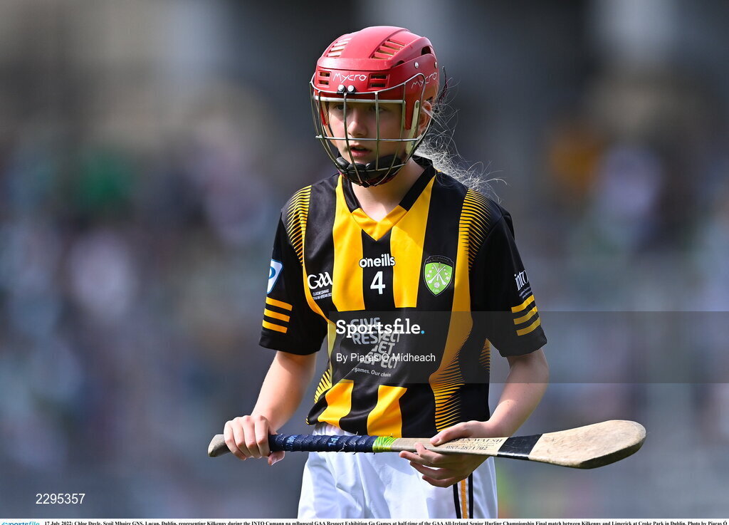 17 July 2022; Chloe Doyle, Scoil Mhuire GNS, Lucan, Dublin, representing Kilkenny during the INTO Cumann na mBunscol GAA Respect Exhibition Go Games at half-time of the GAA All-Ireland Senior Hurling Championship Final match between Kilkenny and Limerick at Croke Park in Dublin. Photo by Piaras Ó Mídheach/Sportsfile