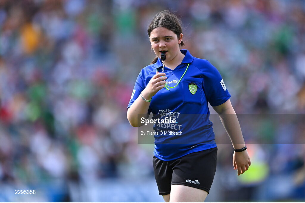 17 July 2022; Referee Tegen Brady, Balbriggan ETNS, Balbriggan, Dublin during the INTO Cumann na mBunscol GAA Respect Exhibition Go Games at half-time of the GAA All-Ireland Senior Hurling Championship Final match between Kilkenny and Limerick at Croke Park in Dublin. Photo by Piaras Ó Mídheach/Sportsfile