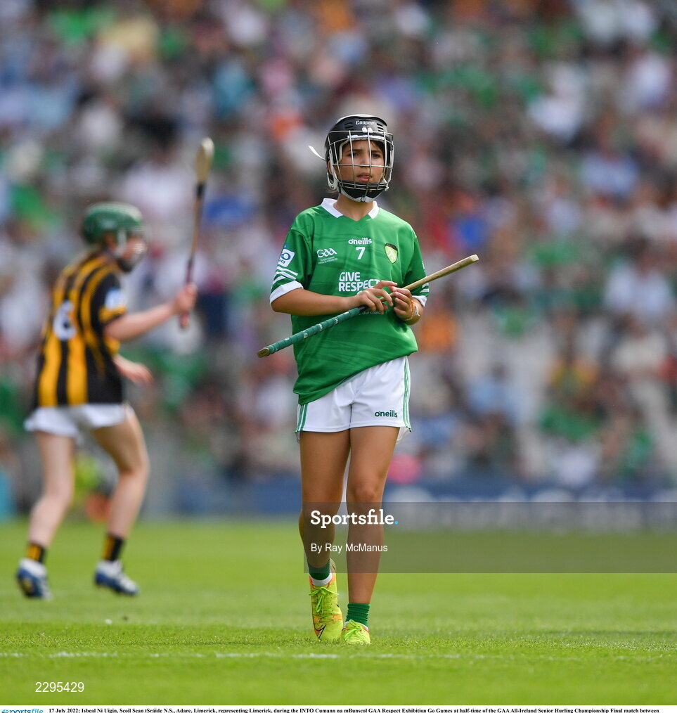 17 July 2022; Isbeal Ni Uigin, Scoil Sean tSráide N.S., Adare, Limerick, representing Limerick, during the INTO Cumann na mBunscol GAA Respect Exhibition Go Games at half-time of the GAA All-Ireland Senior Hurling Championship Final match between Kilkenny and Limerick at Croke Park in Dublin. Photo by Ray McManus/Sportsfile
