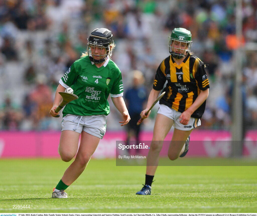 17 July 2022; Katie Conlon, Holy Family Senior School, Ennis, Clare, representing Limerick and Saoirse Fíobhuí, Scoil Lorcáín, An Charraig Dhubh, Co. Átha Cliath, representing Kilkenny during the INTO Cumann na mBunscol GAA Respect Exhibition Go Games at half-time of the GAA All-Ireland Senior Hurling Championship Final match between Kilkenny and Limerick at Croke Park in Dublin. Photo by Ray McManus/Sportsfile