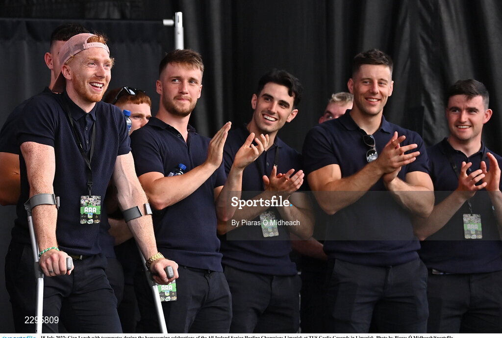 18 July 2022; Cian Lynch with teammates during the homecoming celebrations of the All-Ireland Senior Hurling Champions Limerick at TUS Gaelic Grounds in Limerick. Photo by Piaras Ó Mídheach/Sportsfile