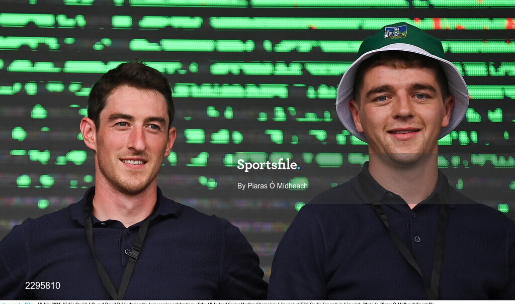 18 July 2022; Nickie Quaid, left, and David Reidy during the homecoming celebrations of the All-Ireland Senior Hurling Champions Limerick at TUS Gaelic Grounds in Limerick. Photo by Piaras Ó Mídheach/Sportsfile