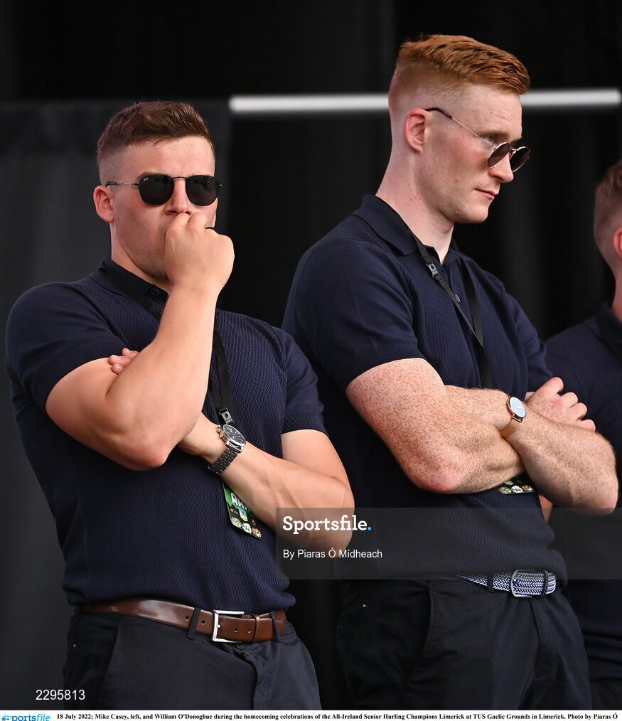 18 July 2022; Mike Casey, left, and William O'Donoghue during the homecoming celebrations of the All-Ireland Senior Hurling Champions Limerick at TUS Gaelic Grounds in Limerick. Photo by Piaras Ó Mídheach/Sportsfile