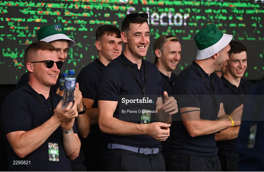 18 July 2022; Diarmaid Byrnes, centre, during the homecoming celebrations of the All-Ireland Senior Hurling Champions Limerick at TUS Gaelic Grounds in Limerick. Photo by Piaras Ó Mídheach/Sportsfile