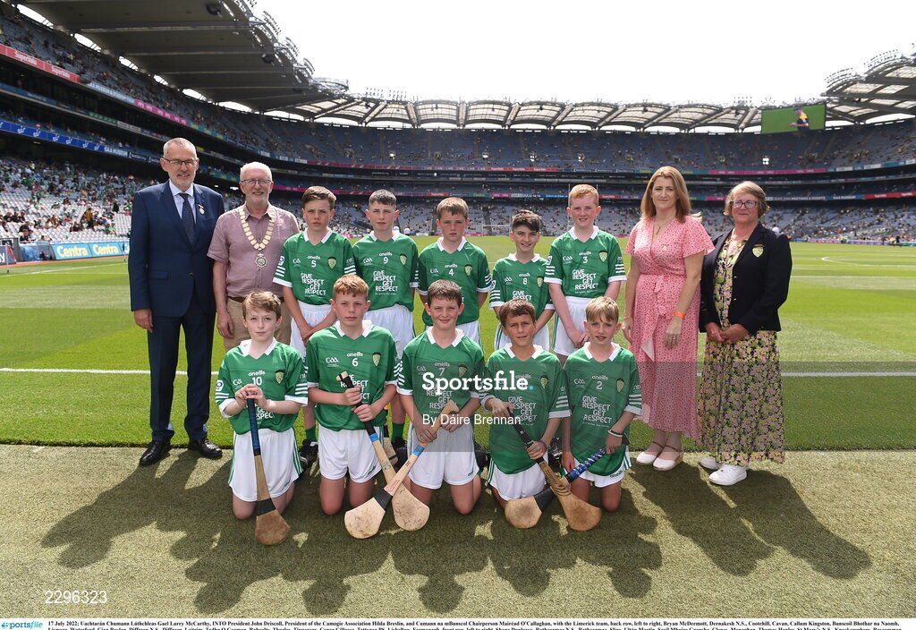 17 July 2022; Uachtarán Chumann Lúthchleas Gael Larry McCarthy, INTO President John Driscoll, President of the Camogie Association Hilda Breslin, and Cumann na mBunscol Chairperson Mairéad O'Callaghan, with the Limerick team, back row, left to right, Bryan McDermott, Dernakesh N.S., Cootehill, Cavan, Callum Kingston, Bunscoil Bhothar na Naomh, Lismore, Waterford, Cian Boylan, Diffreen N.S., Diffreen, Leitrim, Tadhg O Gorman, Rahealty, Thurles, Tipperary, Conor Gilleece, Tattygar PS, Lisbellaw, Fermanagh, front row, left to right, Shane Dunleavy, Rathcormac N.S., Rathcormac, Sligo, Ultán Martin, Scoil Mhuire Gransha, Clones, Monaghan, Thomas Hanley, St Mary’s N.S., Knockcroghery, Roscommon, Seamus O Callaghan, St Paul's N.S., Dooradoyle, Limerick, Matthew Counihan, Glenville N.S., Glenville, Cork, ahead of the INTO Cumann na mBunscol GAA Respect Exhibition Go Games at half-time of the GAA All-Ireland Senior Hurling Championship Final match between Kilkenny and Limerick at Croke Park in Dublin. Photo by Daire Brennan/Sportsfile