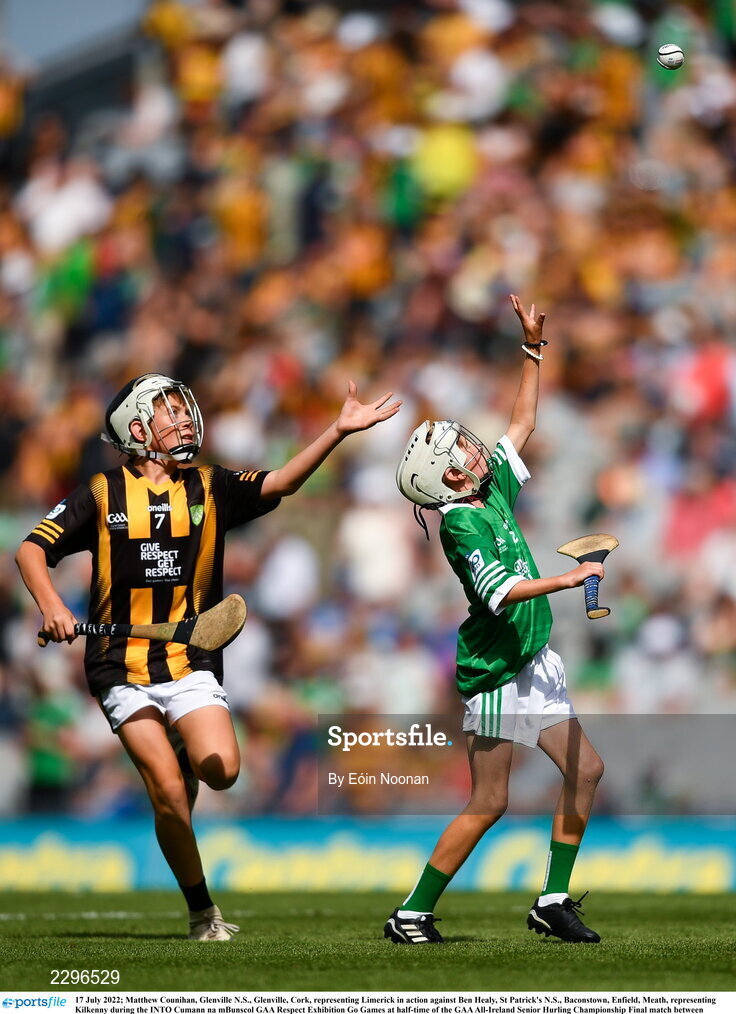 17 July 2022; Matthew Counihan, Glenville N.S., Glenville, Cork, representing Limerick in action against Ben Healy, St Patrick's N.S., Baconstown, Enfield, Meath, representing Kilkenny during the INTO Cumann na mBunscol GAA Respect Exhibition Go Games at half-time of the GAA All-Ireland Senior Hurling Championship Final match between Kilkenny and Limerick at Croke Park in Dublin. Photo by Eóin Noonan/Sportsfile