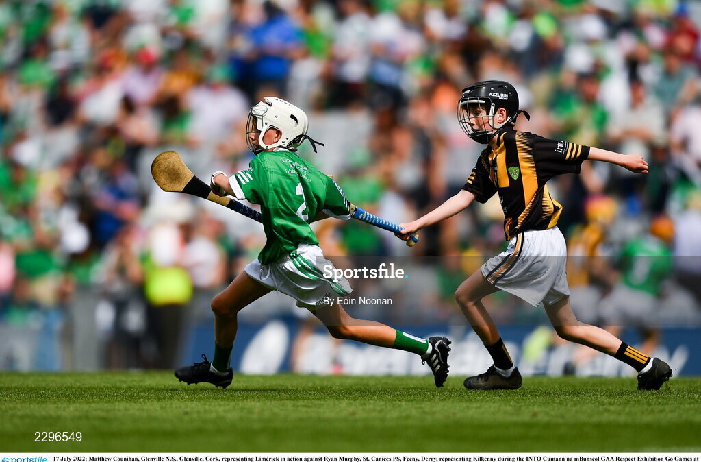 17 July 2022; Matthew Counihan, Glenville N.S., Glenville, Cork, representing Limerick in action against Ryan Murphy, St. Canices PS, Feeny, Derry, representing Kilkenny during the INTO Cumann na mBunscol GAA Respect Exhibition Go Games at half-time of the GAA All-Ireland Senior Hurling Championship Final match between Kilkenny and Limerick at Croke Park in Dublin. Photo by Eóin Noonan/Sportsfile