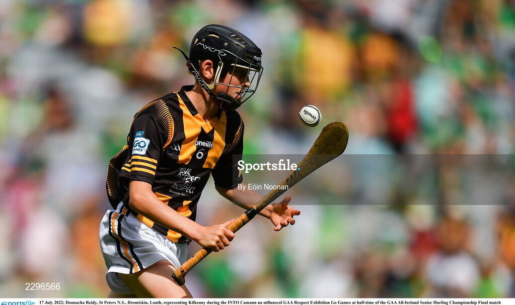 17 July 2022; Donnacha Reidy, St Peters N.S., Dromiskin, Louth, representing Kilkenny during the INTO Cumann na mBunscol GAA Respect Exhibition Go Games at half-time of the GAA All-Ireland Senior Hurling Championship Final match between Kilkenny and Limerick at Croke Park in Dublin. Photo by Eóin Noonan/Sportsfile
