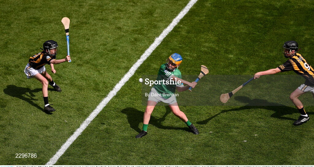 17 July 2022; Cian Boylan, Diffreen N.S., Diffreen, Leitrim, representing Limerick, in action against, Ryan Murphy, St. Canices PS, Feeny, Derry, left, and Patrick Aylward, St Beacons N.S., Mullinavat, Kilkenny, representing Kilkenny, during the INTO Cumann na mBunscol GAA Respect Exhibition Go Games at half-time of the GAA All-Ireland Senior Hurling Championship Final match between Kilkenny and Limerick at Croke Park in Dublin. Photo by Daire Brennan/Sportsfile