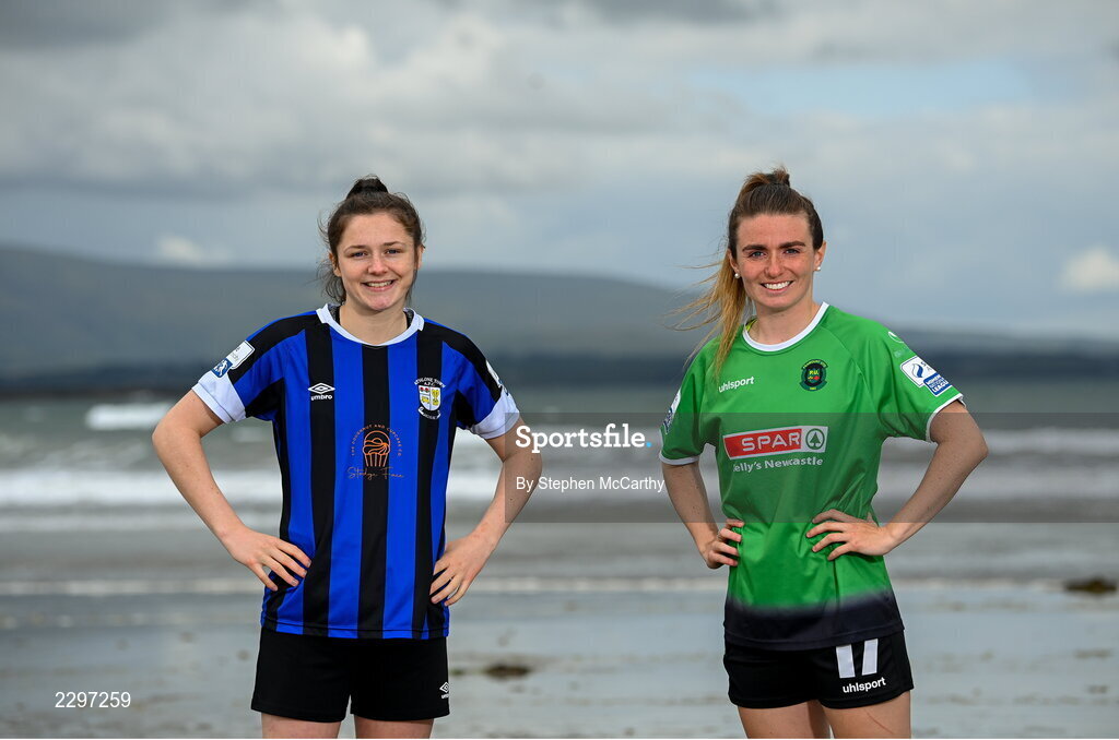 21 July 2022; Roisin Molloy of Athlone Town, left, and Dearbhaile Beirne of Peamount United at Coney Island in Sligo for the announcement the SSE Airtricity Women’s National League will once again light up free-to-air television when the TG4 cameras return for 10 live games. Photo by Stephen McCarthy/Sportsfile