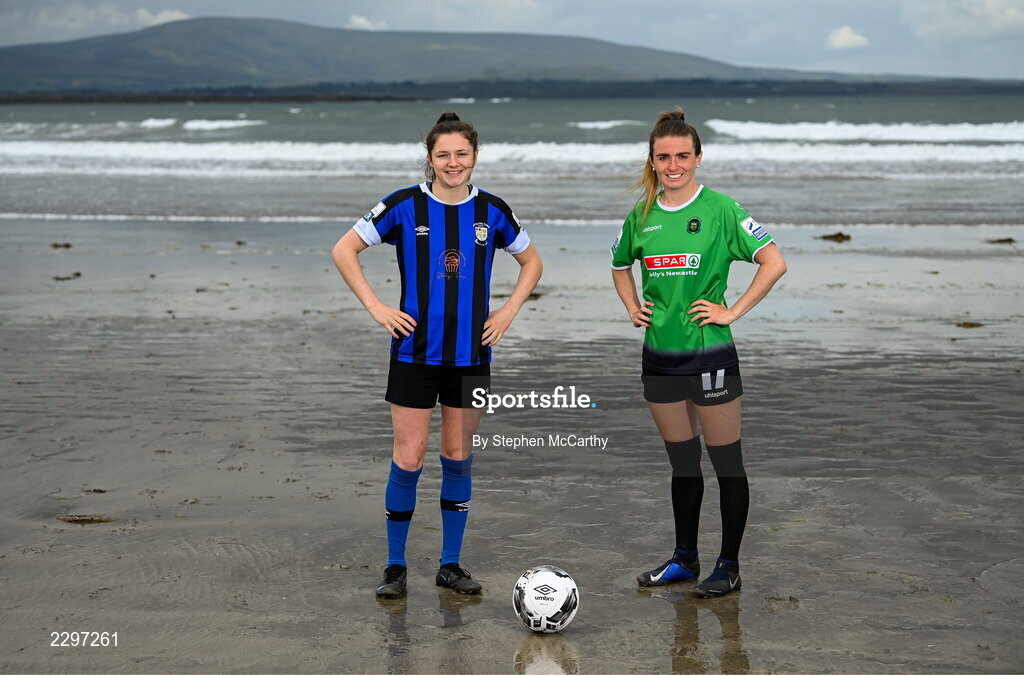 21 July 2022; Roisin Molloy of Athlone Town, left, and Dearbhaile Beirne of Peamount United at Coney Island in Sligo for the announcement the SSE Airtricity Women’s National League will once again light up free-to-air television when the TG4 cameras return for 10 live games. Photo by Stephen McCarthy/Sportsfile