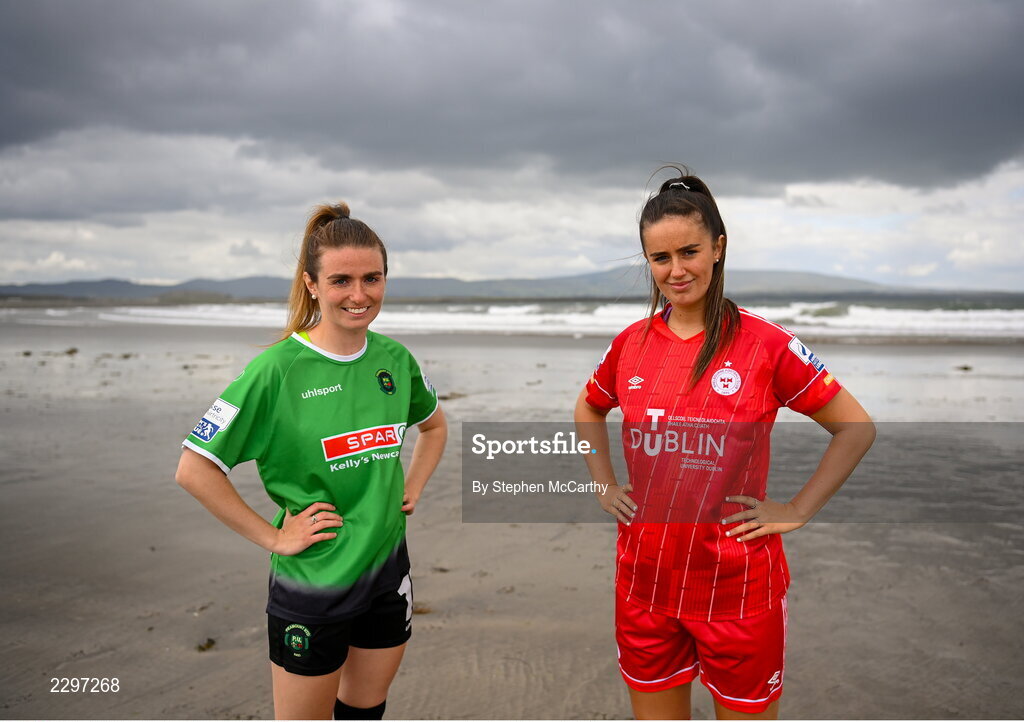 21 July 2022; Dearbhaile Beirne of Peamount United, left, and Alex Kavanagh of Shelbourne at Coney Island in Sligo for the announcement the SSE Airtricity Women’s National League will once again light up free-to-air television when the TG4 cameras return for 10 live games. Photo by Stephen McCarthy/Sportsfile