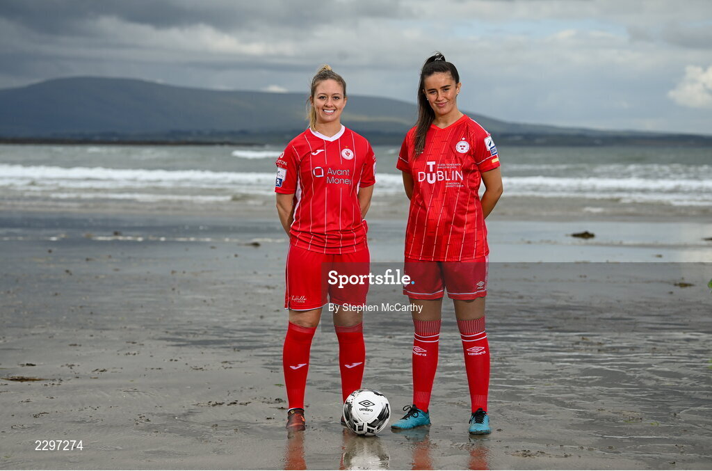 21 July 2022; Emma Hansberry of Sligo Rovers, left, and Alex Kavanagh of Shelbourne at Coney Island in Sligo for the announcement the SSE Airtricity Women’s National League will once again light up free-to-air television when the TG4 cameras return for 10 live games. Photo by Stephen McCarthy/Sportsfile