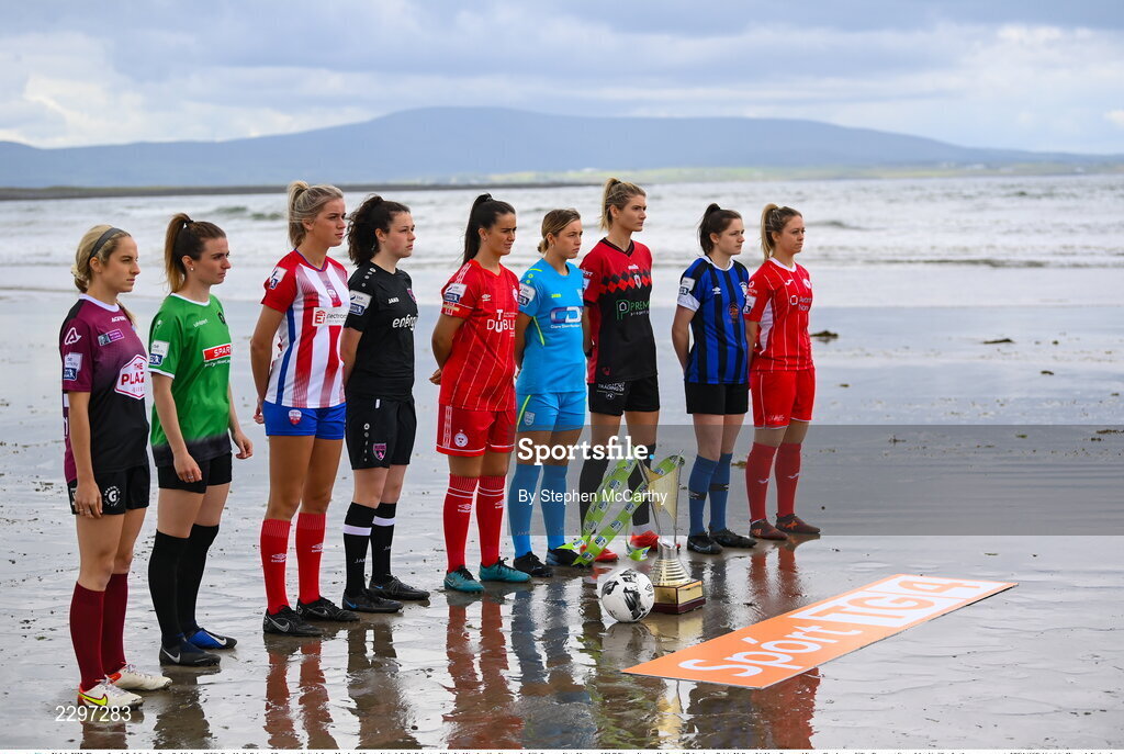 21 July 2022; Players, from left, Julie Ann Russell of Galway WFC, Dearbhaile Beirne of Peamount United, Jesse Mendez of Treaty United, Della Doherty of Wexford Youths, Alex Kavanagh of Shelbourne, Kate Mooney of DLR Waves, Yvonne Hedigan of Bohemians, Roisin Molloy of Athlone Town and Emma Hansberry of Sligo Rovers at Coney Island in Sligo for the announcement the SSE Airtricity Women’s National League will once again light up free-to-air television when the TG4 cameras return for 10 live games. Photo by Stephen McCarthy/Sportsfile