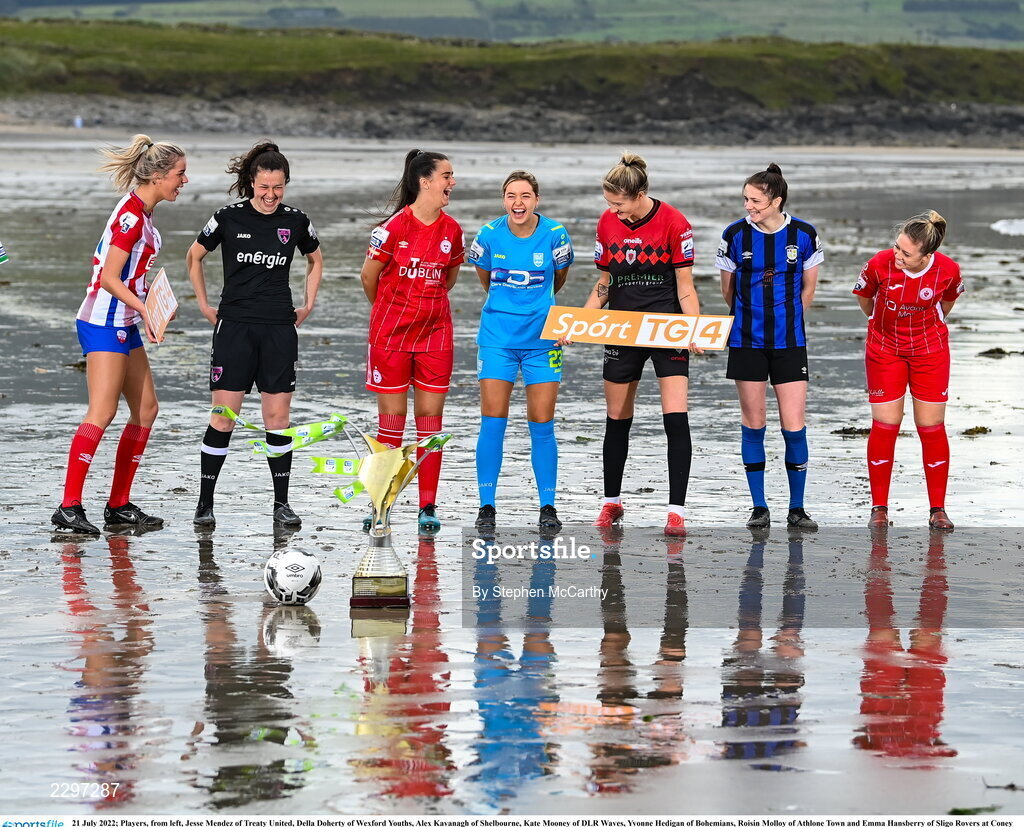21 July 2022; Players, from left, Jesse Mendez of Treaty United, Della Doherty of Wexford Youths, Alex Kavanagh of Shelbourne, Kate Mooney of DLR Waves, Yvonne Hedigan of Bohemians, Roisin Molloy of Athlone Town and Emma Hansberry of Sligo Rovers at Coney Island in Sligo for the announcement the SSE Airtricity Women’s National League will once again light up free-to-air television when the TG4 cameras return for 10 live games. Photo by Stephen McCarthy/Sportsfile