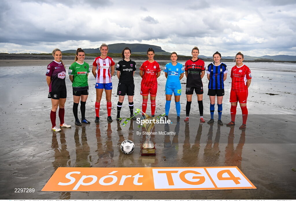 21 July 2022; Players, from left, Julie Ann Russell of Galway WFC, Dearbhaile Beirne of Peamount United, Jesse Mendez of Treaty United, Della Doherty of Wexford Youths, Alex Kavanagh of Shelbourne, Kate Mooney of DLR Waves, Yvonne Hedigan of Bohemians, Roisin Molloy of Athlone Town and Emma Hansberry of Sligo Rovers at Coney Island in Sligo for the announcement the SSE Airtricity Women’s National League will once again light up free-to-air television when the TG4 cameras return for 10 live games. Photo by Stephen McCarthy/Sportsfile