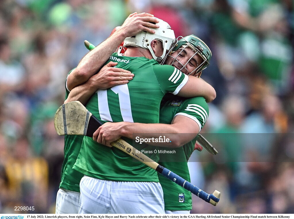 17 July 2022; Limerick players, from right, Seán Finn, Kyle Hayes and Barry Nash celebrate after their side's victory in the GAA Hurling All-Ireland Senior Championship Final match between Kilkenny and Limerick at Croke Park in Dublin. Photo by Piaras Ó Mídheach/Sportsfile