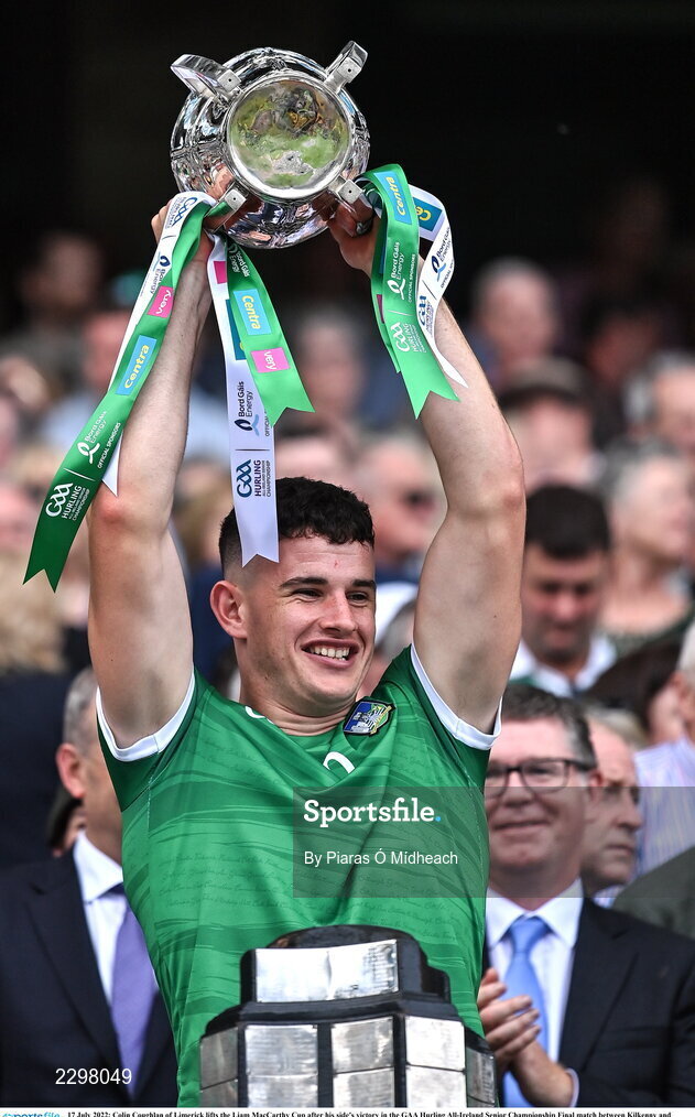 17 July 2022; Colin Coughlan of Limerick lifts the Liam MacCarthy Cup after his side's victory in the GAA Hurling All-Ireland Senior Championship Final match between Kilkenny and Limerick at Croke Park in Dublin. Photo by Piaras Ó Mídheach/Sportsfile