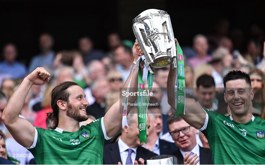 17 July 2022; Limerick players Tom Morrissey, left, and Dan Morrissey lift the Liam MacCarthy Cup after their side's victory in the GAA Hurling All-Ireland Senior Championship Final match between Kilkenny and Limerick at Croke Park in Dublin. Photo by Piaras Ó Mídheach/Sportsfile
