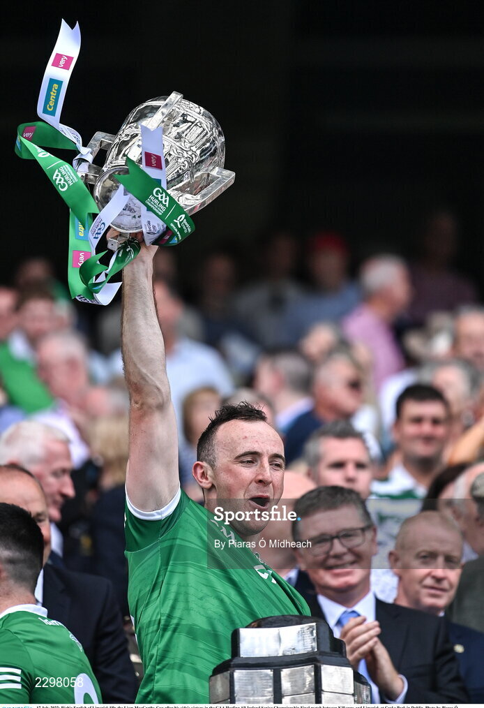 17 July 2022; Richie English of Limerick lifts the Liam MacCarthy Cup after his side's victory in the GAA Hurling All-Ireland Senior Championship Final match between Kilkenny and Limerick at Croke Park in Dublin. Photo by Piaras Ó Mídheach/Sportsfile