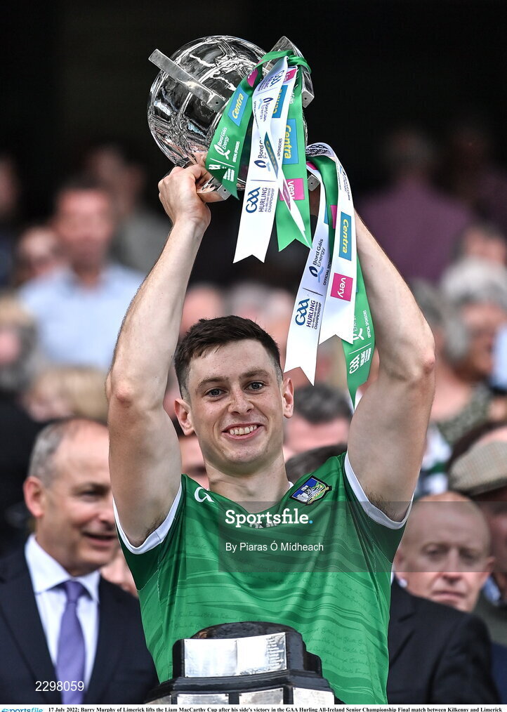 17 July 2022; Barry Murphy of Limerick lifts the Liam MacCarthy Cup after his side's victory in the GAA Hurling All-Ireland Senior Championship Final match between Kilkenny and Limerick at Croke Park in Dublin. Photo by Piaras Ó Mídheach/Sportsfile