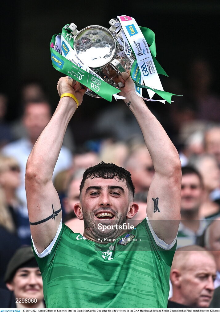 17 July 2022; Aaron Gillane of Limerick lifts the Liam MacCarthy Cup after his side's victory in the GAA Hurling All-Ireland Senior Championship Final match between Kilkenny and Limerick at Croke Park in Dublin. Photo by Piaras Ó Mídheach/Sportsfile