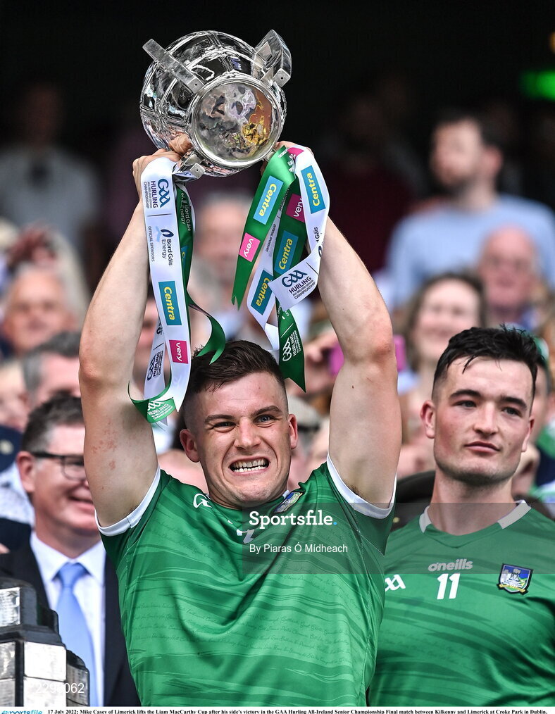17 July 2022; Mike Casey of Limerick lifts the Liam MacCarthy Cup after his side's victory in the GAA Hurling All-Ireland Senior Championship Final match between Kilkenny and Limerick at Croke Park in Dublin. Photo by Piaras Ó Mídheach/Sportsfile