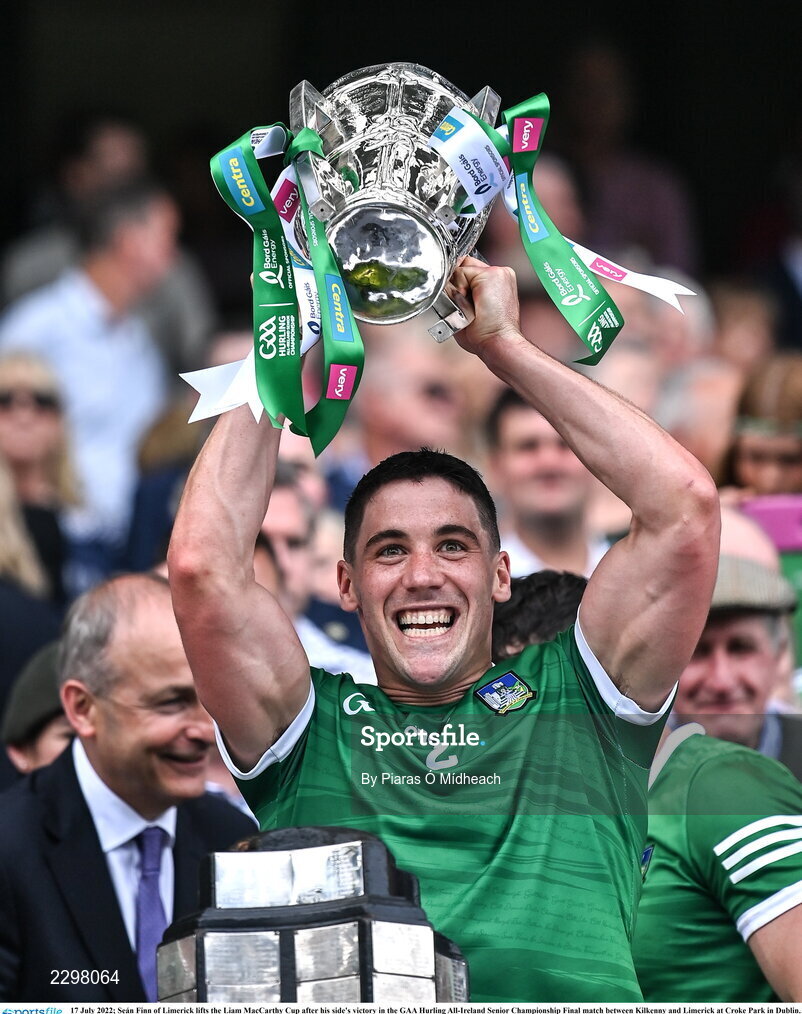 17 July 2022; Seán Finn of Limerick lifts the Liam MacCarthy Cup after his side's victory in the GAA Hurling All-Ireland Senior Championship Final match between Kilkenny and Limerick at Croke Park in Dublin. Photo by Piaras Ó Mídheach/Sportsfile