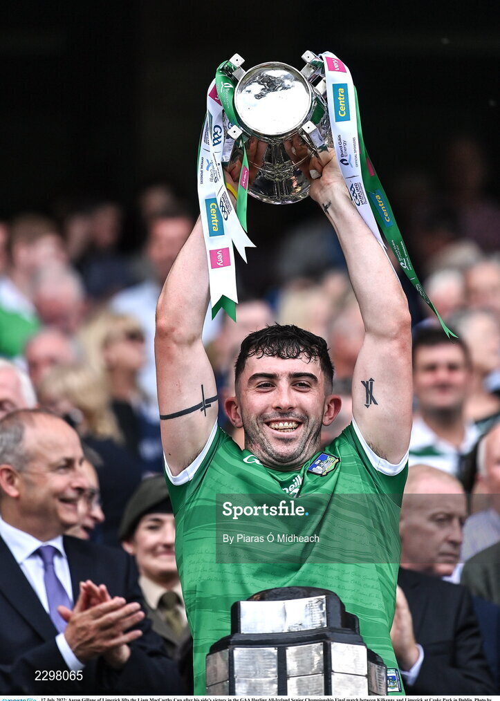 17 July 2022; Aaron Gillane of Limerick lifts the Liam MacCarthy Cup after his side's victory in the GAA Hurling All-Ireland Senior Championship Final match between Kilkenny and Limerick at Croke Park in Dublin. Photo by Piaras Ó Mídheach/Sportsfile