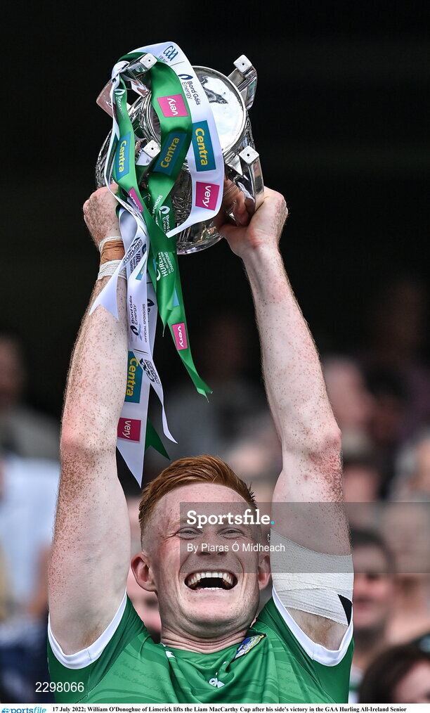 17 July 2022; William O'Donoghue of Limerick lifts the Liam MacCarthy Cup after his side's victory in the GAA Hurling All-Ireland Senior Championship Final match between Kilkenny and Limerick at Croke Park in Dublin. Photo by Piaras Ó Mídheach/Sportsfile
