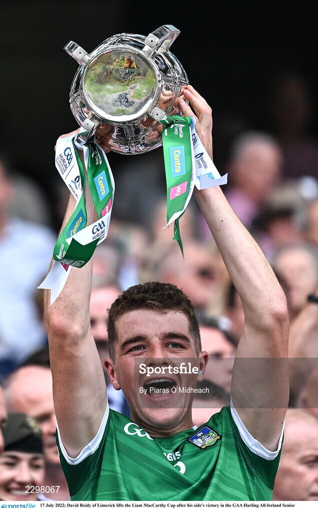 17 July 2022; David Reidy of Limerick lifts the Liam MacCarthy Cup after his side's victory in the GAA Hurling All-Ireland Senior Championship Final match between Kilkenny and Limerick at Croke Park in Dublin. Photo by Piaras Ó Mídheach/Sportsfile