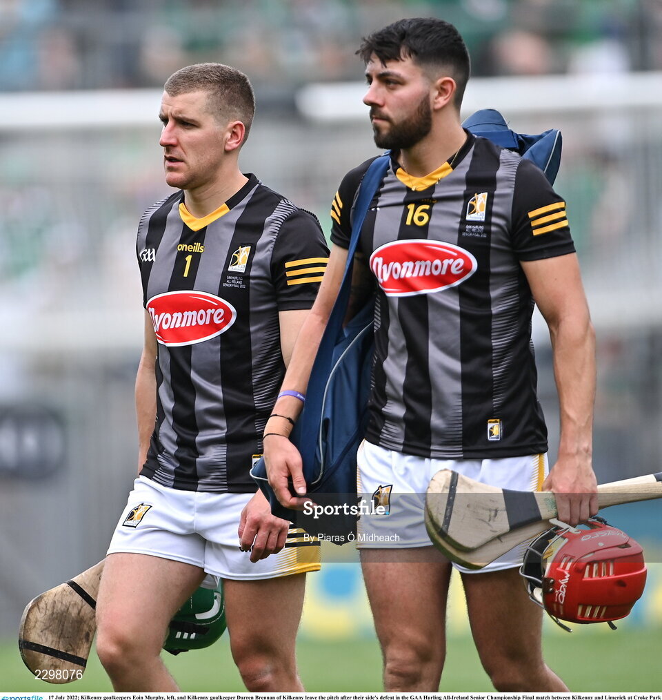 17 July 2022; Kilkenny goalkeepers Eoin Murphy, left, and Kilkenny goalkeeper Darren Brennan of Kilkenny leave the pitch after their side's defeat in the GAA Hurling All-Ireland Senior Championship Final match between Kilkenny and Limerick at Croke Park in Dublin. Photo by Piaras Ó Mídheach/Sportsfile