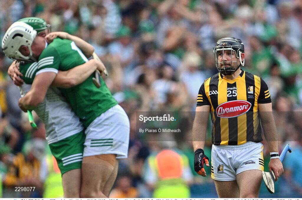 17 July 2022; Richie Hogan of Kilkenny looks as Limerick players Nickie Quaid, left, and Kyle Hayes celebrate after the GAA Hurling All-Ireland Senior Championship Final match between Kilkenny and Limerick at Croke Park in Dublin. Photo by Piaras Ó Mídheach/Sportsfile