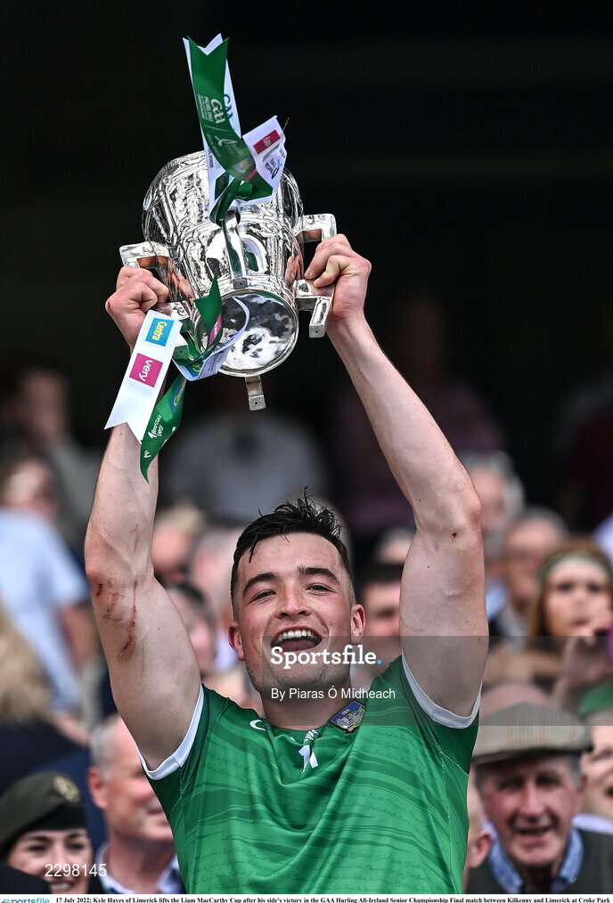 17 July 2022; Kyle Hayes of Limerick lifts the Liam MacCarthy Cup after his side's victory in the GAA Hurling All-Ireland Senior Championship Final match between Kilkenny and Limerick at Croke Park in Dublin. Photo by Piaras Ó Mídheach/Sportsfile