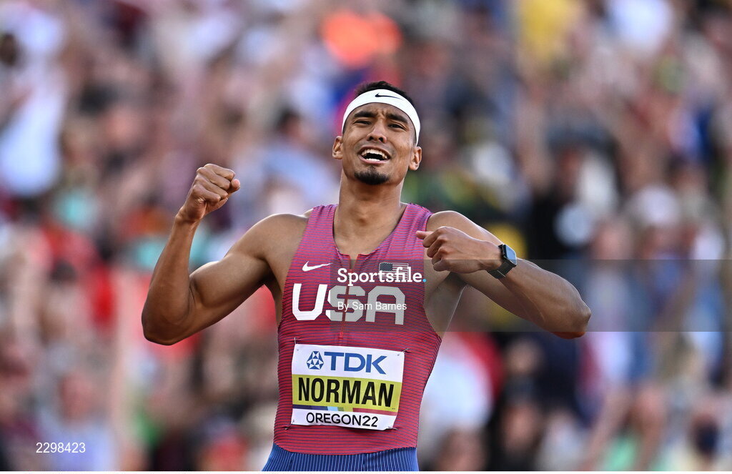 22 July 2022; Michael Norman of USA after winning the men's 400m final during day eight of the World Athletics Championships at Hayward Field in Eugene, Oregon, USA. Photo by Sam Barnes/Sportsfile