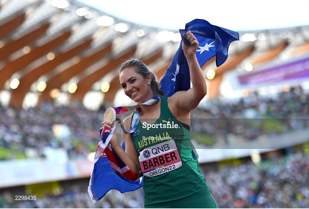 22 July 2022; Kelsey-Lee Barber of Australia after winning gold in the women's javelin throw during day eight of the World Athletics Championships at Hayward Field in Eugene, Oregon, USA. Photo by Sam Barnes/Sportsfile
