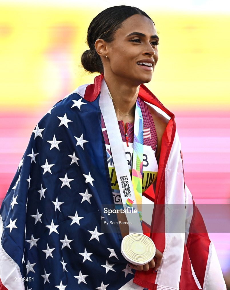 22 July 2022; Sydney McLaughlin of USA after winning gold in the women's 400m hurdles final during day eight of the World Athletics Championships at Hayward Field in Eugene, Oregon, USA. Photo by Sam Barnes/Sportsfile