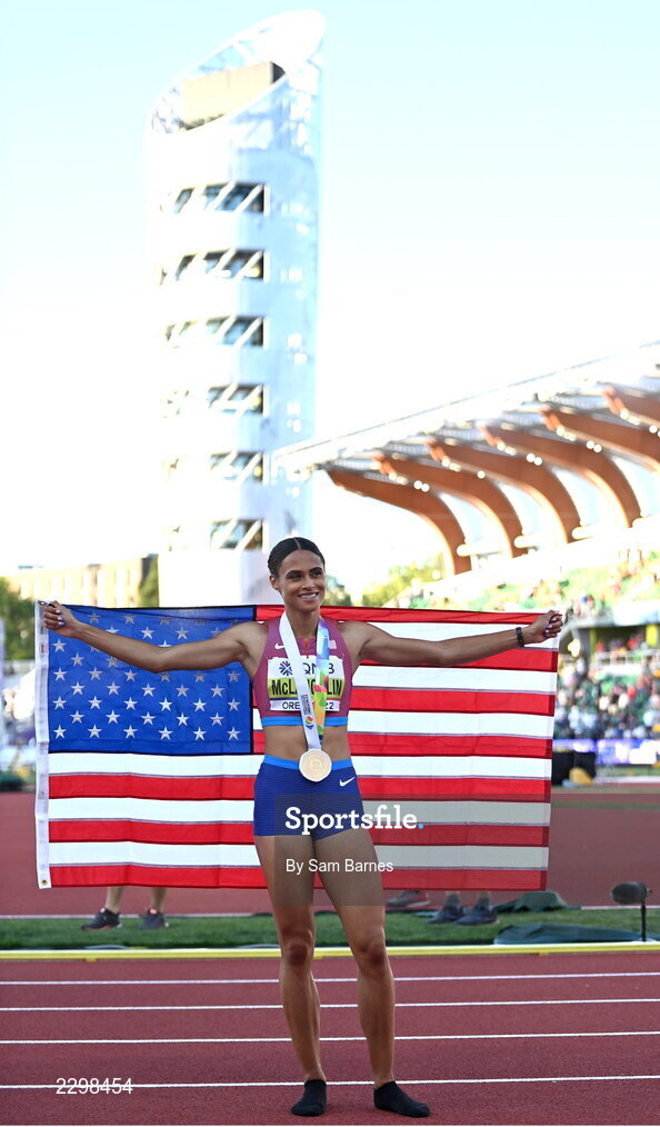 22 July 2022; Sydney McLaughlin of USA after winning gold in the women's 400m hurdles final during day eight of the World Athletics Championships at Hayward Field in Eugene, Oregon, USA. Photo by Sam Barnes/Sportsfile