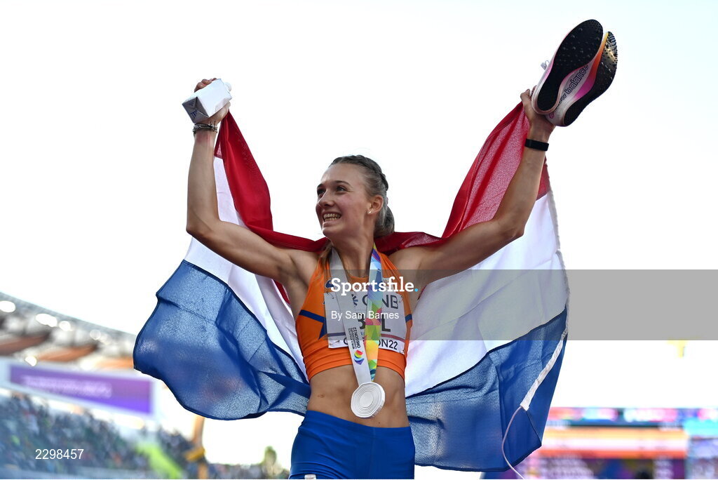22 July 2022; Femke Bol of Netherlands celebrates after winning silver in the women's 400m hurdles final during day eight of the World Athletics Championships at Hayward Field in Eugene, Oregon, USA. Photo by Sam Barnes/Sportsfile
