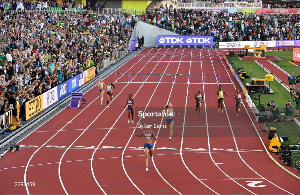 22 July 2022; Sydney McLaughlin of USA wins the women's 400m hurdles final during day eight of the World Athletics Championships at Hayward Field in Eugene, Oregon, USA. Photo by Sam Barnes/Sportsfile