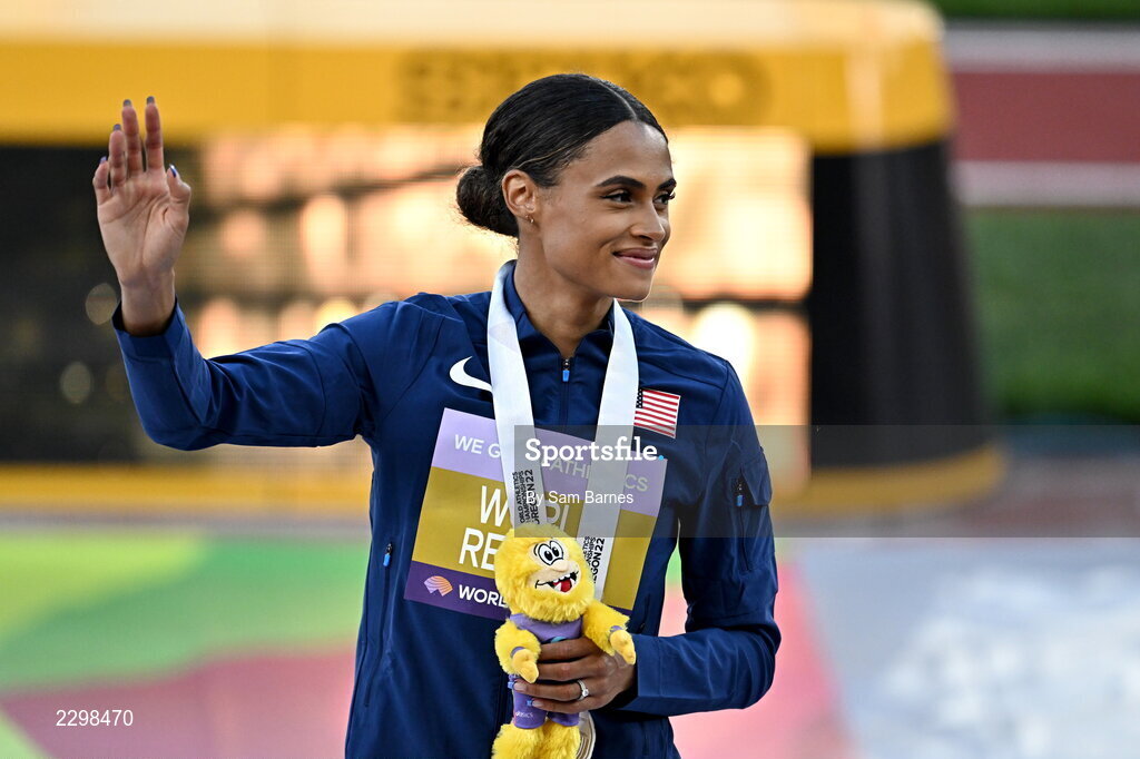 22 July 2022; Sydney McLaughlin of USA with her gold medal after winning the women's 400m hurdles final during day eight of the World Athletics Championships at Hayward Field in Eugene, Oregon, USA. Photo by Sam Barnes/Sportsfile