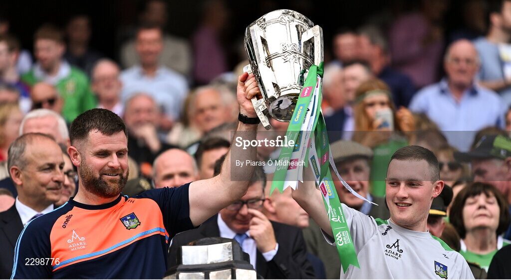 17 July 2022; Limerick goalkeeping coach Timmy Houlihan and assistant goalkeeping coach Alan Feely lift the Liam MacCarthy Cup after the GAA Hurling All-Ireland Senior Championship Final match between Kilkenny and Limerick at Croke Park in Dublin. Photo by Piaras Ó Mídheach/Sportsfile