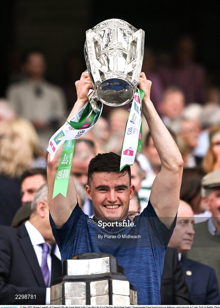 17 July 2022; Ronan Connolly of Limerick lifts the Liam MacCarthy Cup after the GAA Hurling All-Ireland Senior Championship Final match between Kilkenny and Limerick at Croke Park in Dublin. Photo by Piaras Ó Mídheach/Sportsfile