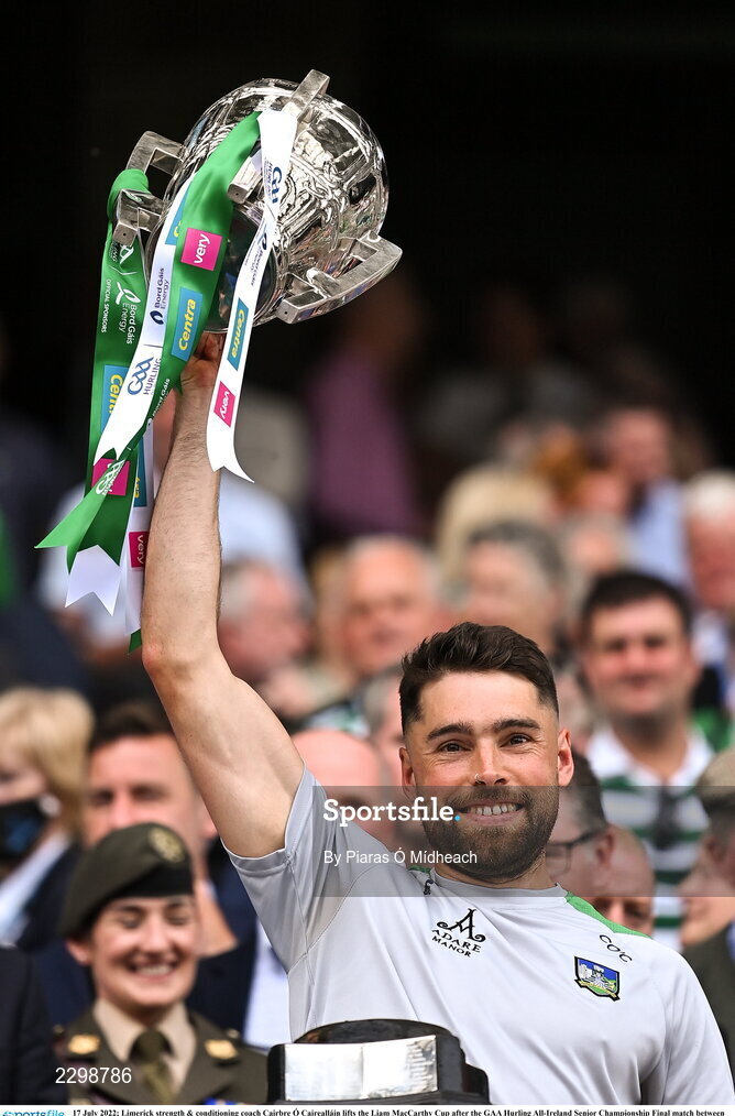 17 July 2022; Limerick strength & conditioning coach Cairbre Ó Cairealláin lifts the Liam MacCarthy Cup after the GAA Hurling All-Ireland Senior Championship Final match between Kilkenny and Limerick at Croke Park in Dublin. Photo by Piaras Ó Mídheach/Sportsfile